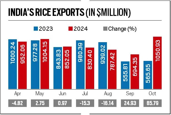 According to the data released by the Ministry of Commerce & Industry on Thursday, rice exports valued at $1,050.93 million in October 2024, which is 85.79 per cent higher compared to $565.65 million in the same month of the last year. The rice exports were valued at $694.35 million in September this year.