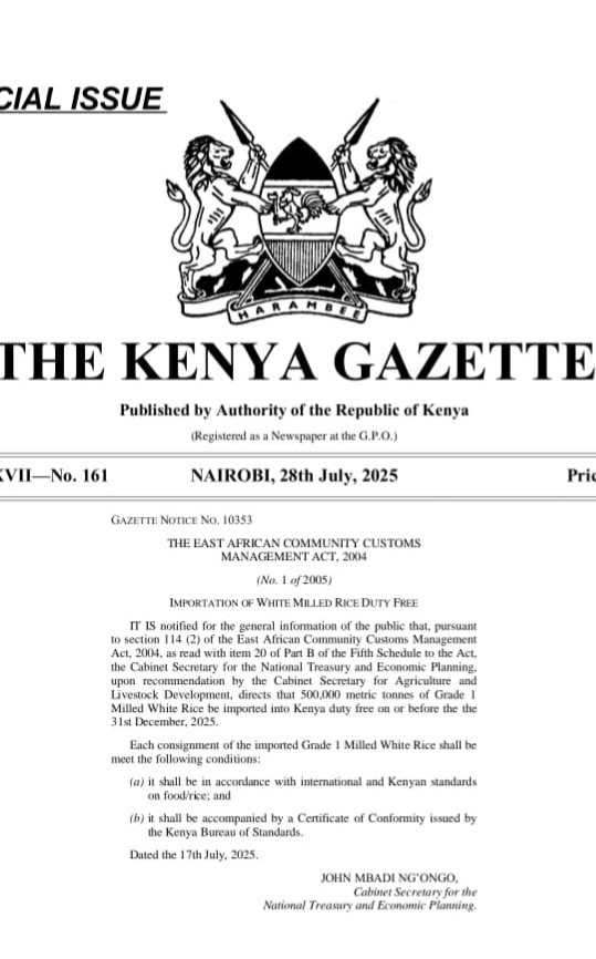IT IS notified for the general information of the public that, pursuant to section 114 (2) of the East African Community Customs Management Act, 2004, as read with item 20 of Part B of the Fifth Schedule to the Act, the Cabinet Secretary for the National Treasury and Economic Planning, upon recommendation by the Cabinet Secretary for Agriculture and Livestock Development, directs that 500,000 metric tonnes of Grade I Milled White Rice be imported into Kenya duty free on or before the 31st December, 2025.