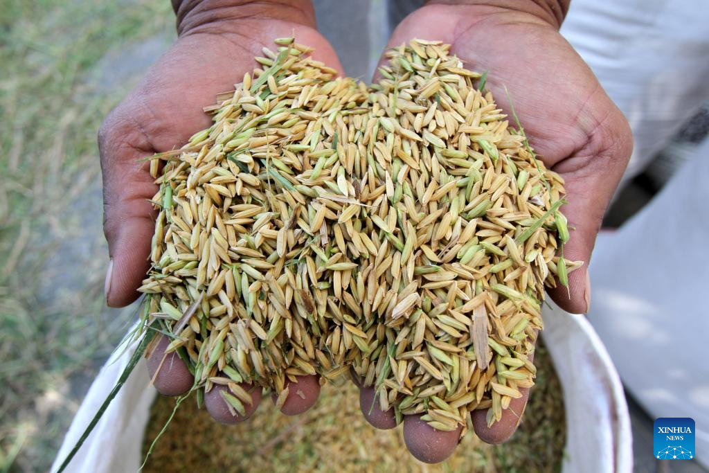 A farmer holds harvested rice in Sanggung village, Sukoharjo regency, Central Java Province, Indonesia, on July 21, 2025. Indonesia has recorded a 48 percent increase in rice production, with government rice reserves reaching 4.2 million tons, according to President Prabowo Subianto. (Photo by Bram Selo/Xinhua)