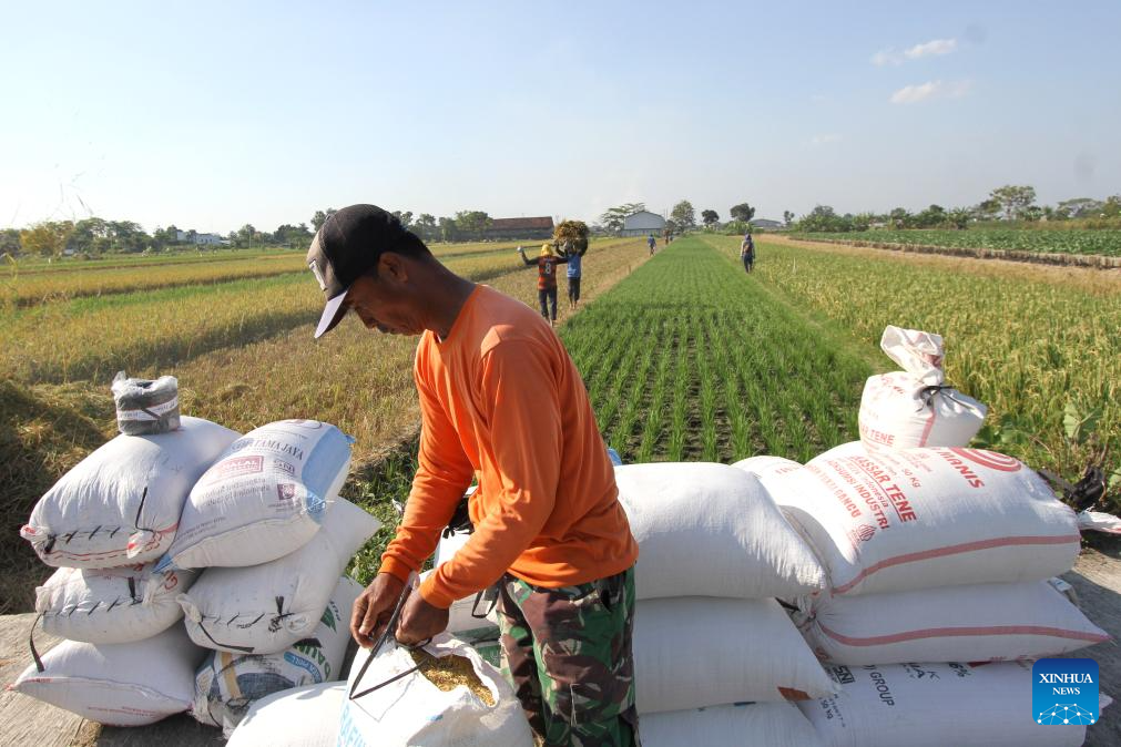 A farmer packs harvested rice in Sanggung village, Sukoharjo regency, Central Java Province, Indonesia, on July 21, 2025. Indonesia has recorded a 48 percent increase in rice production, with government rice reserves reaching 4.2 million tons, according to President Prabowo Subianto. (Photo by Bram Selo/Xinhua)