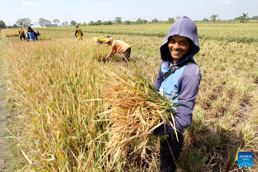 Farmers harvest rice in Sanggung village, Sukoharjo regency, Central Java Province, Indonesia, on July 21, 2025. Indonesia has recorded a 48 percent increase in rice production, with government rice reserves reaching 4.2 million tons, according to President Prabowo Subianto. (Photo by Bram Selo/Xinhua)