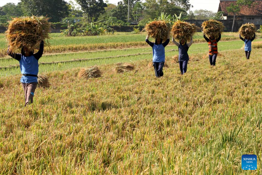 Farmers carry harvested rice in Sanggung village, Sukoharjo regency, Central Java Province, Indonesia, on July 21, 2025. Indonesia has recorded a 48 percent increase in rice production, with government rice reserves reaching 4.2 million tons, according to President Prabowo Subianto. (Photo by Bram Selo/Xinhua)