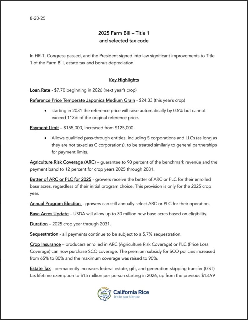 Here is a summary of the new Commodity Title of the Farm Bill for California rice recently passed by Congress along with selected tax provisions important to agriculture.
